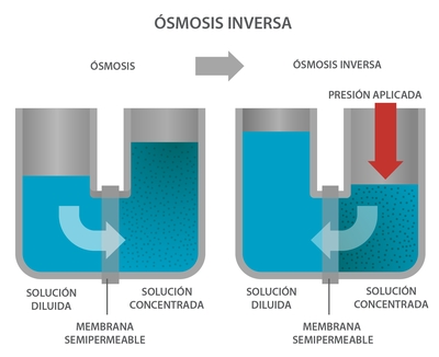 La ósmosis inversa es un proceso para purificar el agua. Está pensado para aguas duras con gran cantidad de sales; por ejemplo, el agua cerca de las costas. El objetivo de la ósmosis inversa es obtener un agua pura para su consumo eliminando los olores y sabores no deseados. El proceso consiste en forzar el agua a pasar a través una membrana semi-permeable. La solución no deseada se expulsará del circuito por el desagüe.